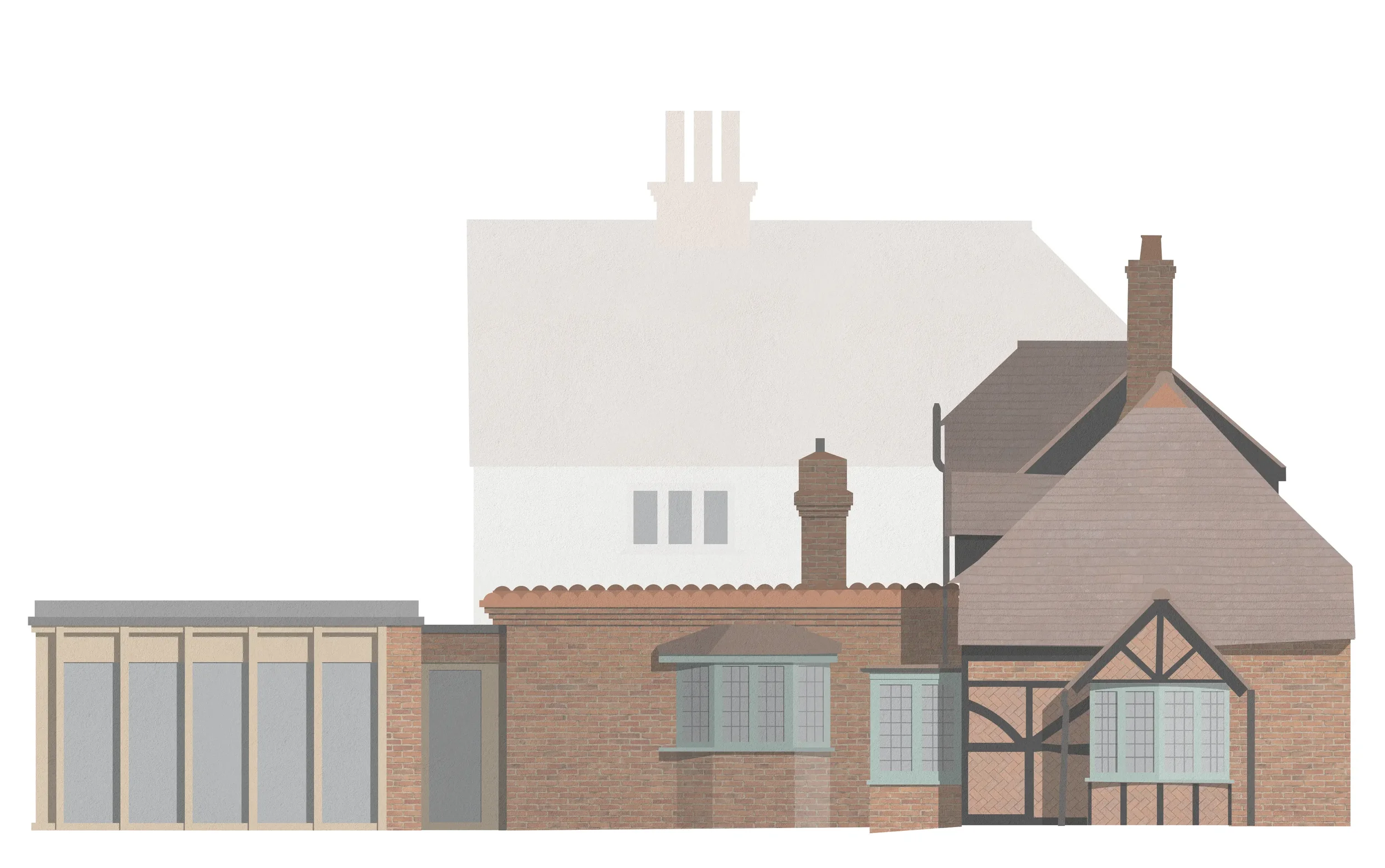 Elevation of the proposal in context. Collaged illustration with timber extension to the rear of historic cottage.